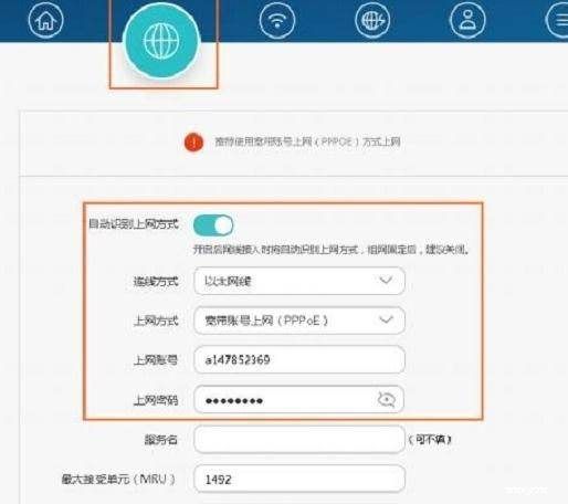 (1)、点击“我要上网”――>打开“自动识别上网方式”――>如果检测到“上网方式”是:宽带拨号上网(PPPoE),在“上网账号”、“上网密码”填写:宽带运营商提供的,宽带账号、宽带密码――>点击“保存”