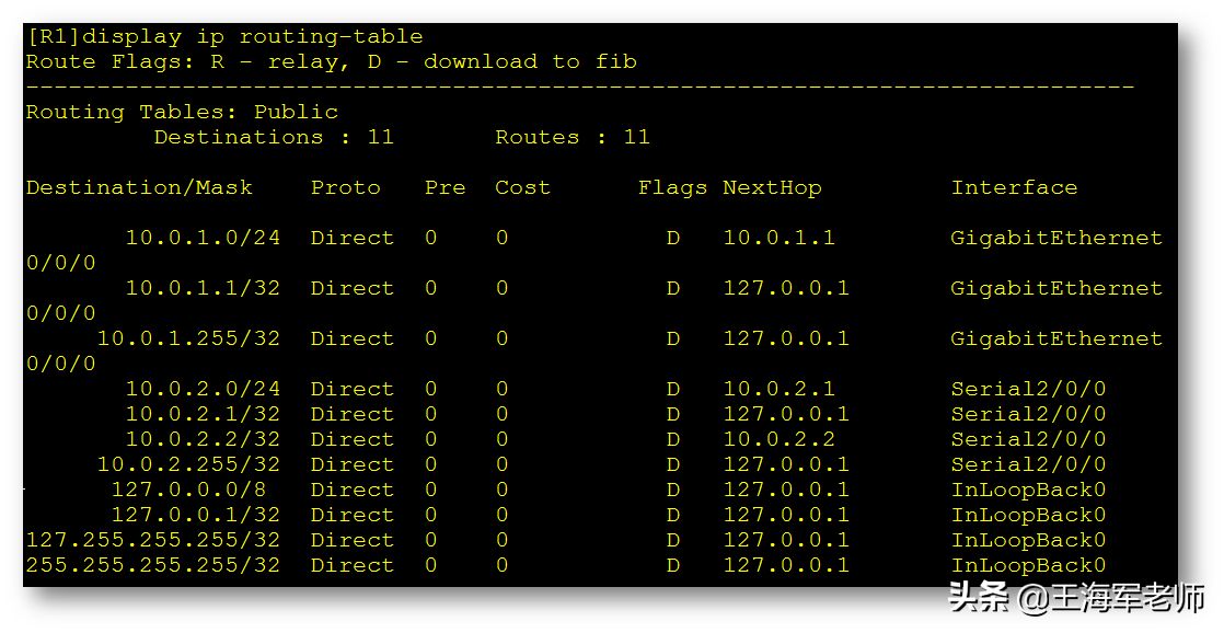 使用display ip routing-table命令来查看R1路由器的路由表信息