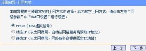5、点击下一步,进入上网方式设置,可以看到有三种上网方式的选择,如果是拨号的话那么就用PPPoE;动态IP设置是电脑直接插上外网网线就可以用的,上层有DHCP服务器的;静态IP一般是专线方面的,也可能是小区带宽等,或想要固定IP的,上层没有DHCP服务器。