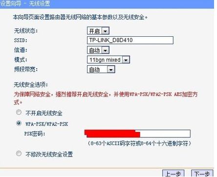 7、然后下一步后进入到的是无线设置,我们可以看到信道、模式、安全选项、SSID等等,一般SSID就是一个名字,可以按照自己的喜好随便填。然后模式大多用11bgn,无线安全选项我们要选择wpa-psk/wpa2-psk,避免轻意让人家破解而蹭网。