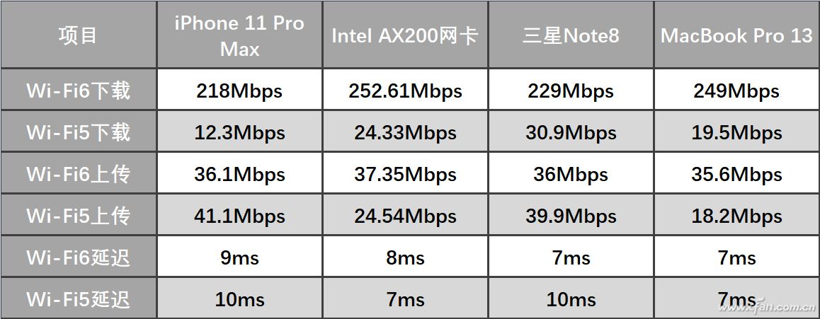 当然,光说不练是不行的,我们还是用实际测试来看一看吧。准备的设备是支持Wi-Fi6的iPhone 11 Pro Max、台式机Intel AX200网卡(支持WiFi6)以及Wi-Fi5标准的三星Note8、MacBook Pro 13,测试软件为Speedtest。路由器分别选用500元级别的主流Wi-Fi6路由器以及运营商入户光猫自带的Wi-Fi5路由。
