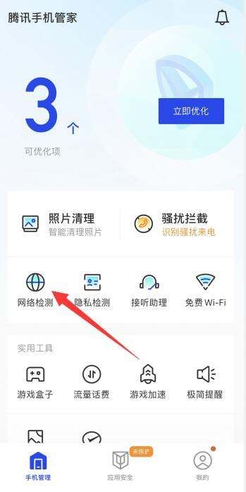 打开手机桌面腾讯手机管家,点击手机管理选项,点击网络检测。