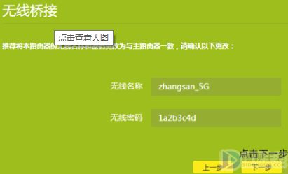 此处可以设置副路由器的 无线网络 名称和无线密码,默认与主路由器一致。如果需要实现无线漫游,请勿修改此处直接点击 下一步,如下: