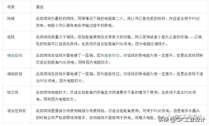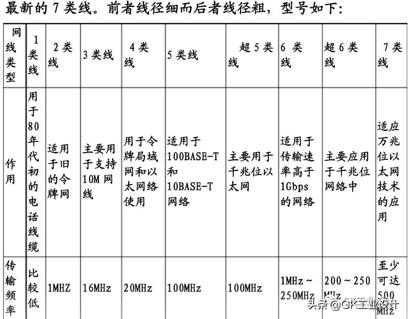 - 四类线:该类电缆的传输带宽为20MHz,用于语音传输和最高传输速率16Mbps的数据传输主要用于基于令牌的局域网和 10BASE-T/100BASE-T,已被标准淘汰。