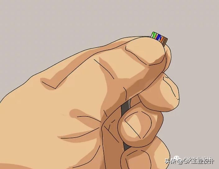 去皮时请务必谨慎操作,切勿夹或切伤内部铜线。有一个较好的方法是在离端口约三公分的位置,用剪刀或小刀沿线缆一侧纵向向外切开。这样可以降低剪伤内部铜线绝缘包层的风险。找到线缆内部与铜线并股的细线,如果无细线则就用内部铜线来褪除线缆的外皮,一只手抓住外皮,另一只手抓住铜线往一侧拉。剪掉褪下来的外皮,留下约 30 毫米长的双绞线组。可以看到 8 根线绞成了 4 对。每一对两根线中,一根为彩色,另一根为带有彩色细条纹的白线,细条纹的颜色与这一对线中的彩色线颜色相同,因此白线被称为迹线。