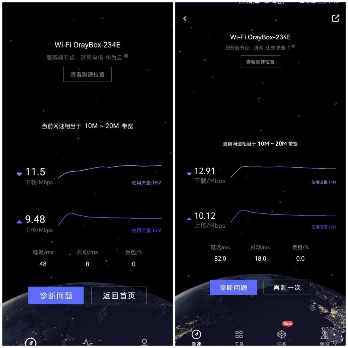 顺便用一键测试这个专业软件,测试了一下,下载速度为12.91Mbps,上传速度为10.12Mbps,速度基本满足日常使用,也是很不错了,科技君所在地区信号很是不好,手机插卡状态进网页都很费劲,然后路由器插卡之后,状态明显好了很多,甚为满意。