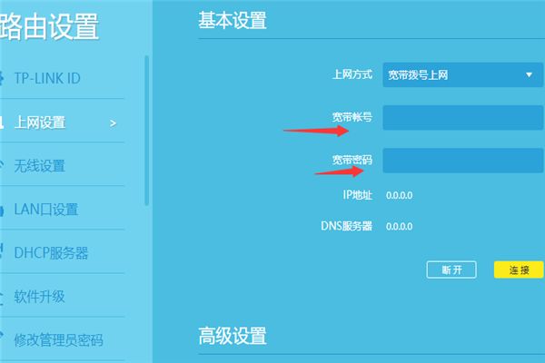 5、路由器登陆成功后,找到路由器的【上网设置】,上网方式里面选择“宽带拨号上网”,在下面输入宽带账号,宽带密码,点击连接。