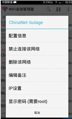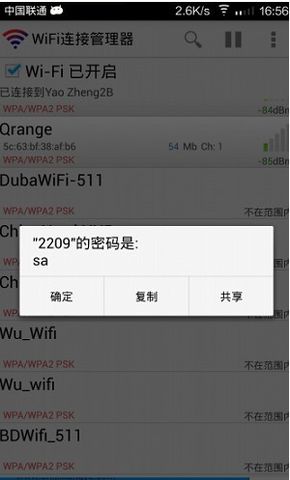 然后安装打开Wifi连接管理器之后,我们就可以看到,手机之前连接过的所有WiFI网络名称。