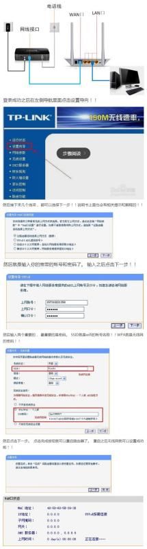 您好,室外近室内的主线连接路由器的WAN口,第一个接口,在拿一根网线,连接路由器第2 3 4 随便选择一个接口.(LAN口)连接电脑.打开路由器的设置地址.通常为192.168.1.1或192.168.0.1,您也可以查看一下路由器的机身帖有标签,上面写的路由器的设置地址,以及登录路由器的账号和密码(通常为admin)进入路由器后,为了防止2次操作,建议您先将路由器恢复出厂设置,选择设置向导,上网方式选PPPOE.输入正确的宽带账号以及密码,下一步.输入无线密码,下一步.完成即可!