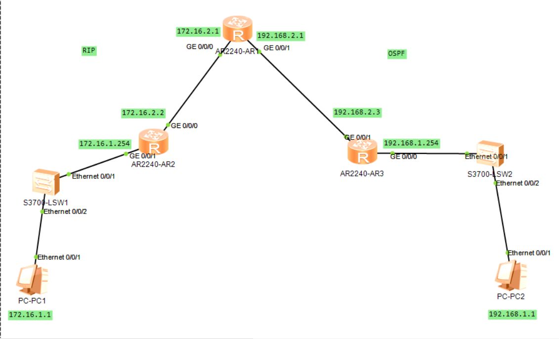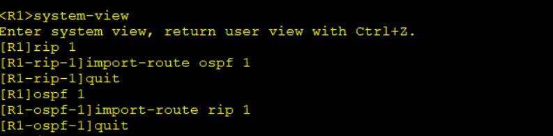 4.在R1路由器配置RIP重分发OSPF、OSPF重分发RIP(两个区域的协议不同,需要进行协议重分发,从而实现线路互通)