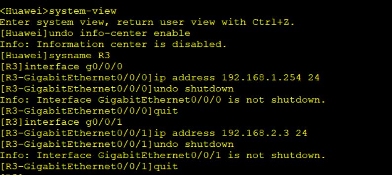 [R3-GigabitEthernet0/0/0]ip address 192.168.1.254 24 //设置IP地址