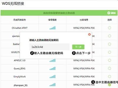 3、扫描并连接主路由器信号,找到主路由器的信号,点击 选择,路由器自动提示输入主路由器的无线密码,请正确输入,并点击下一步;