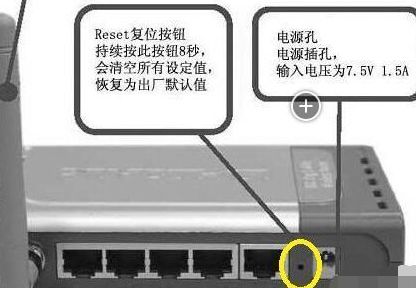 2、如果密码不对。那就重置路由器。在路由器网线口一侧有个小口,它就是复位键。复位键需要用牙签、针或者笔芯等细长的东西才能按到,一直按住reset按钮8秒以上,然后会看到所有指示灯同时闪亮一下后表示重置成功。重置后路由器所有的设定值被还原成默认值,此时路由器的登陆密码也就变成了初始密码了。