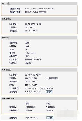 WAN口状态、当前软件版本、LAN口状态、WAN口流量统计。