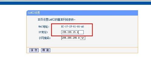 5、在“LAN口设置”中弹出的界面里,我们选择“修改”默认登录IP地址,比如说这里我修改为“155.155.15.1”这样,一般情况下,是不是有人知道我们的路由器登录密码的,显得很安全,大家点击“保存”就可以了。
