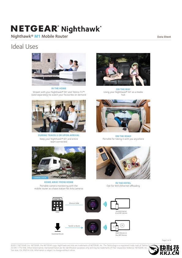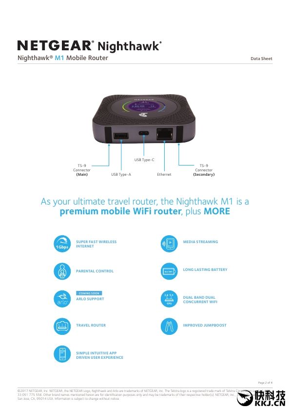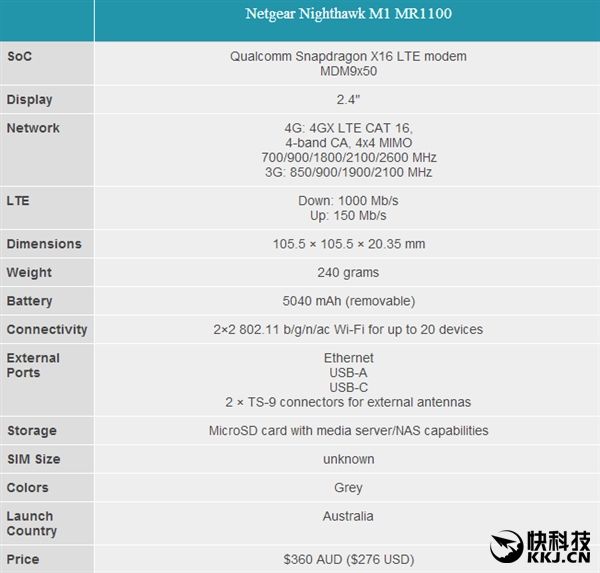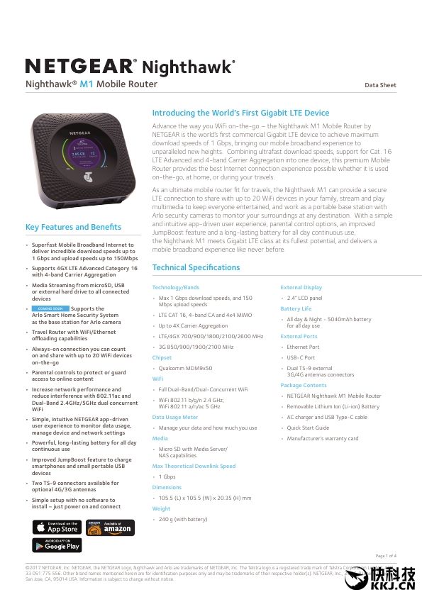 网件(NetGear)也配合发布了一款全新的便携式路由器“NightHawk M1”(MR1100),全球首个可提供高达1Gbps的4G LTE网络下载速度。