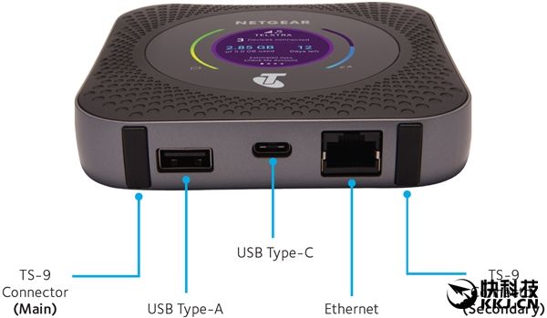 它也支持连接普通有线网络,自带了千兆RJ-45接口,另有USB Type-C/A接口各一个、TS-9扩展天线接口两个。