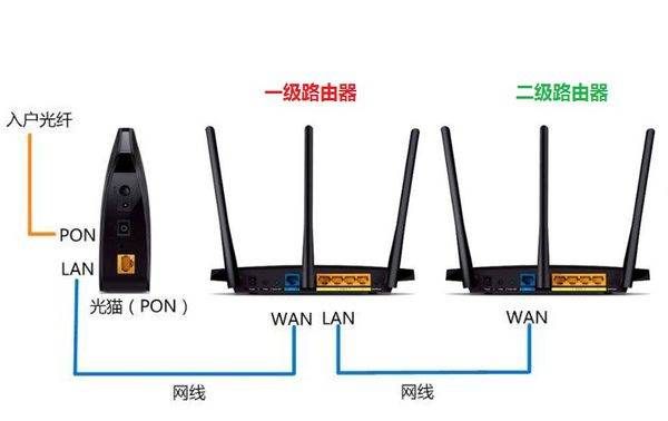 需要先准备2根网线,一根网线一头连接第一个路由器的LAN接口(即1\2\3\4),网线另一头连接第二个路由器的WAN接口。