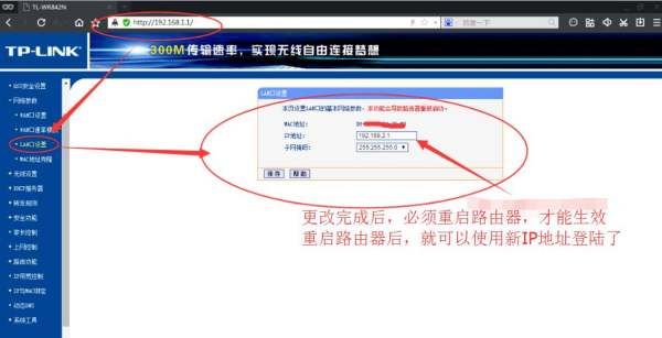 3、在路由器左侧找到【网络参数】选项,选择【LAN口设置】,设置【IP地址】为新的路由器IP,完成后点击【保存】,重启路由器后生效;