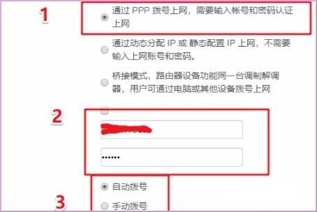 4、然后,完成上述步骤后,在主路由器中设置宽带Internet访问帐户和密码。请记住选择“PPPOE”访问模式。不同路由器的宽带上网帐号设置不同,但操作方法相同。首先设置宽带帐户和密码,以确保路由器可以访问Internet,如下图所示,然后进入下一步。