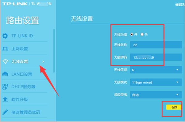 6、再点击无线设置,输入需要的无线信号名称和密码点击保存按钮。
