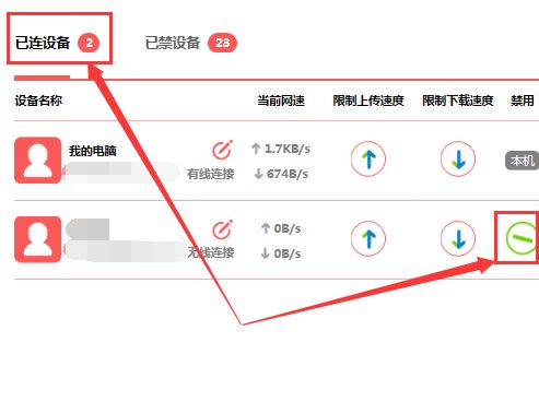 四、在“已连设备”列表内找到这个蹭网的用户,点击其右边的“禁用”按钮。