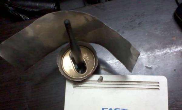 去掉易拉罐底部,将铁皮剪开展平,保留一部分与带孔的顶部相连。