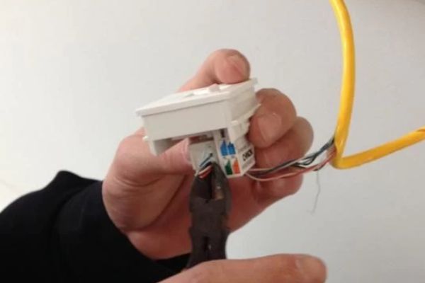 4、第四步:接线时,看底部箱线的颜色,并逐线的颜色同网线,卡在独立的卡槽上,然后压合即可。