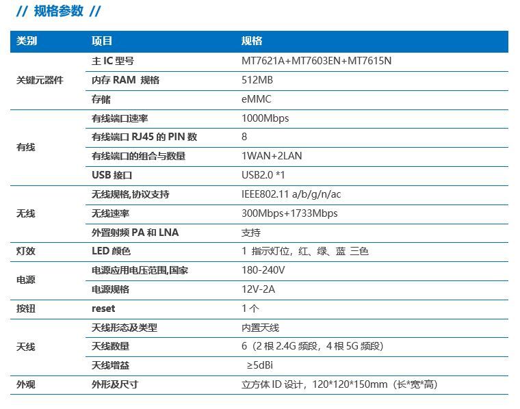 主推的功能为:2100M双频无线、全千兆网口、内置独立信号放大器、内置6天线、双核CPU、512MB大容量内存、智能加速计划、支持IPV6。
