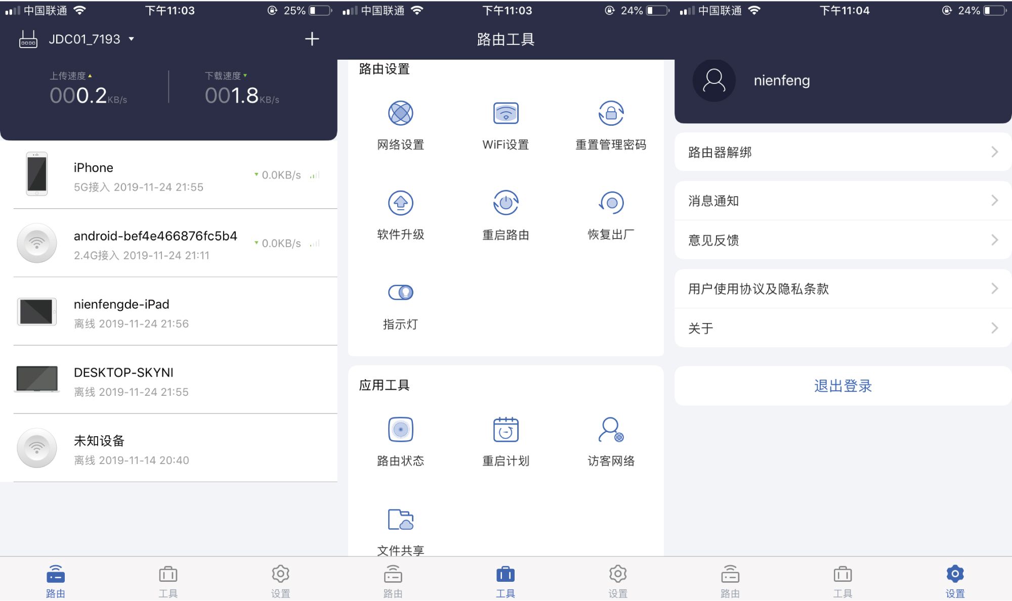作为一款智能路由,APP控制是最基本的,而且京东云无线宝可用京东账号登陆,绑定路由后可外网远程控制,所有的下挂设备都可以在APP进行查阅设备信息,限速,上线提醒,禁止联网等信息,也可以对网络、WIFI进行设置,建立定时重启计划,启动访客访问,甚至通过USB共享移动存储设备里的数据。