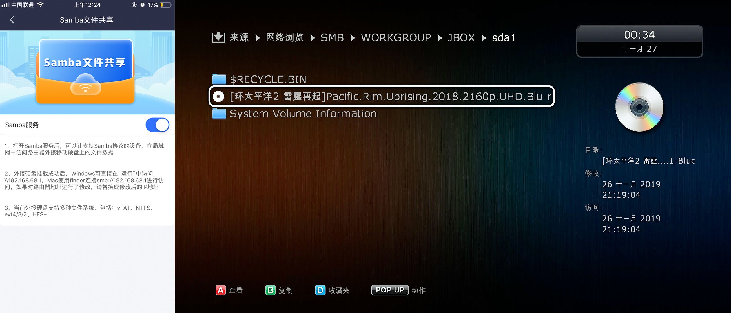 实测开启京东云无线宝的SMB共享后,PC或者高清播放器可以在局域网中浏览USB存储设备内的数据,不过USB2.0确实是个瓶颈,实测85g的4K UHD版本的环太平洋2有卡顿现象,但是可以流畅观看1080p的电影和剧集。
