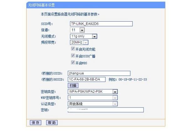 接着回到副路由器的无线设置部分,无线基本设置,开启wds,扫描附件的无线信号,选中主路由器的ssid,选择加密方式(主路由器的),填写密码(主路由器的wifi密码),保存重启。