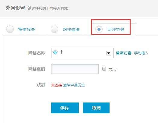 1、在路由器的外网设置中选择"无线中继",类似上面例子的设置,输入目标wifi信息。