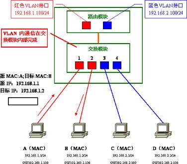 其以vlan的虚端口为接口,vlan端口间的通信由交换机内部路由模块实现。