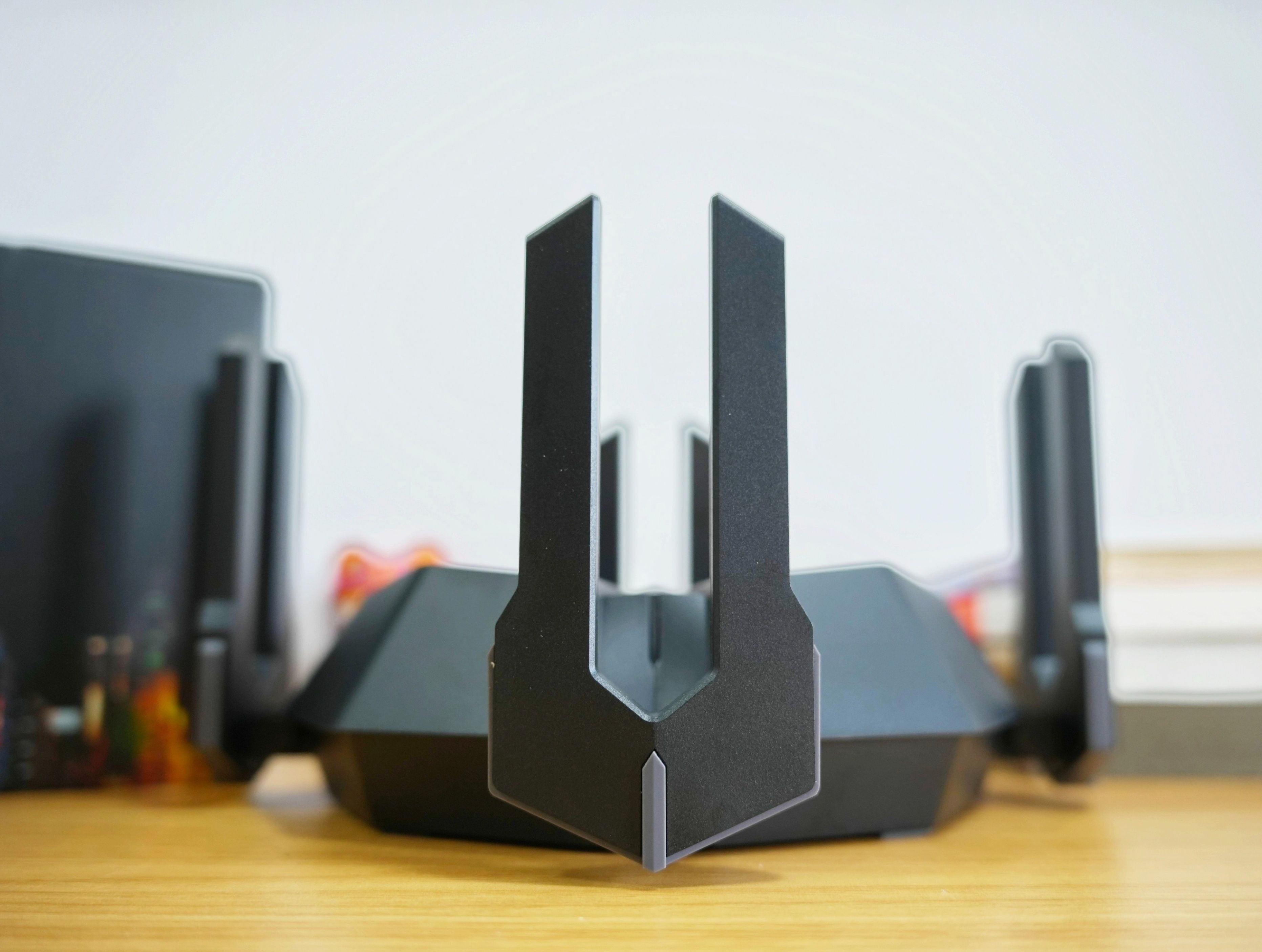 想必都有注意到了锐捷天蝎电竞路由器的天线设计得十分与众不同,按照目前的路由器配置来看,基本都是标配了WIFI 6和8根天线。而这8根天线设计又不像普通路由器一般是独立存在的,锐捷天蝎电竞路由器将其两两组队,形成了类似于一个“盾牌”的形状,当然也很像“天蝎”本身的那对钳子,故此组成4组8根天线的设计,同时还为路由器的设计思路探索出了更多的可能性。