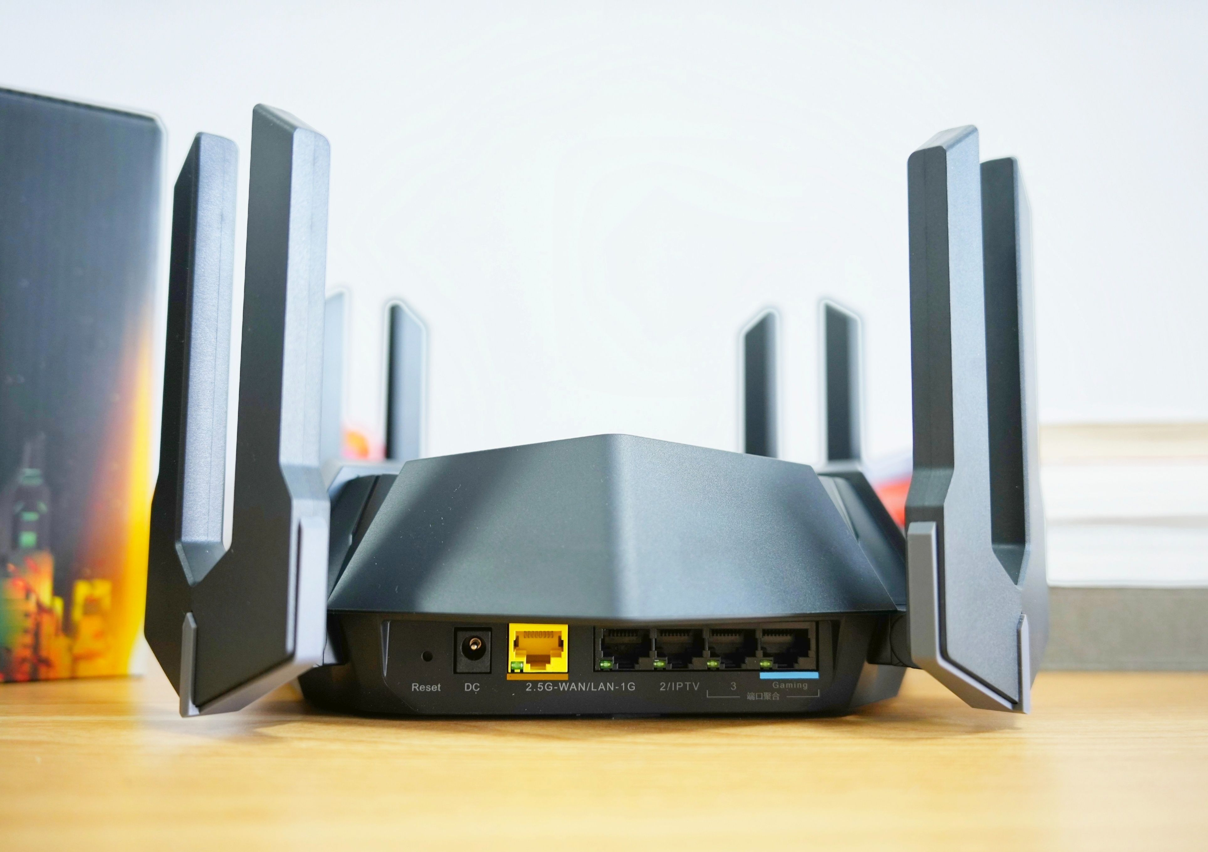 那在锐捷天蝎电竞路由器的背后则是一排的接口,从左到右依次是电源口、2.5G网口(黄色)、千兆网口、千兆LAN口和电竞网口。其中,2.5网口和千兆网口均是双WAN口聚合,包含了2.5+1.0G,在此基础上速率超过1.6Gbps,双条带宽不浪费。而千兆LAN口同样也是双LAN口聚合,即1.0G+1.0G,在此基础上速率高达1.8Gbps,满足双网卡PC和NAS等多网口家庭储存提升内网传输。总之,这几个接口充分满足了日常的使用需求。