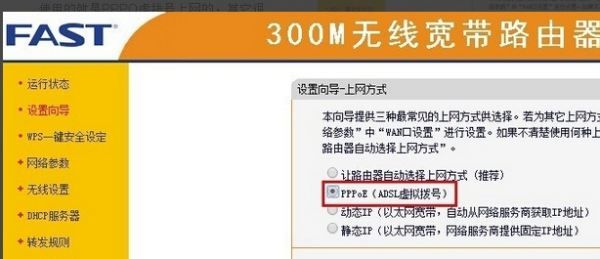 5、根据设置向导一步一步设置,选择上网方式,通常ADSL用户则选择第一项PPPoE,如果用的是其他的网络服务商则根据实际情况选择下面两项,如果不知道该怎么选择的话,直接选择第一项自动选择即可,方便新手操作,选完点击下一步;