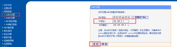 3、通过电脑浏览器登陆界面LAN口IP改成192.168.2.1,避免与主路由器IP网段有冲突,如下图。