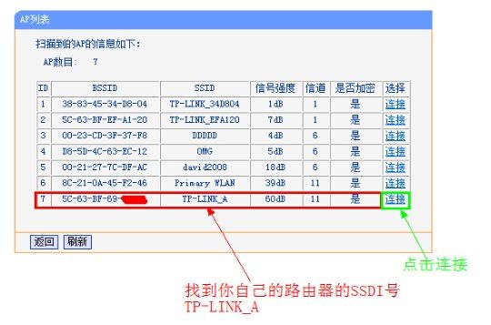 4、在列表中找到自己的主路由器的wifi名称,并记下信道,点击连接。