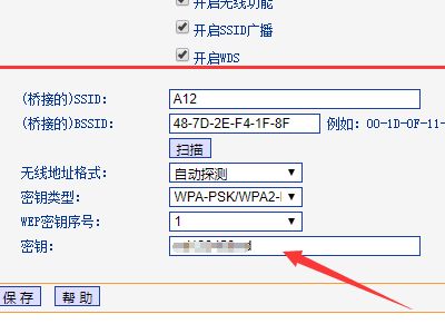 5、路由器会自动补全相关信息,需要把主路由器的wifi密码填入密钥中,点击保存。