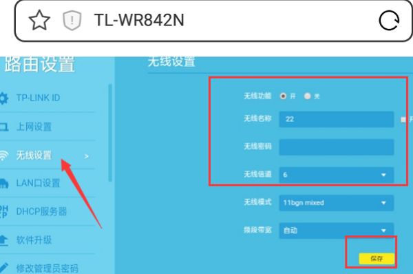 10、再点击无线设置,开启无线功能。输入无线名称和密码点击保存按钮。