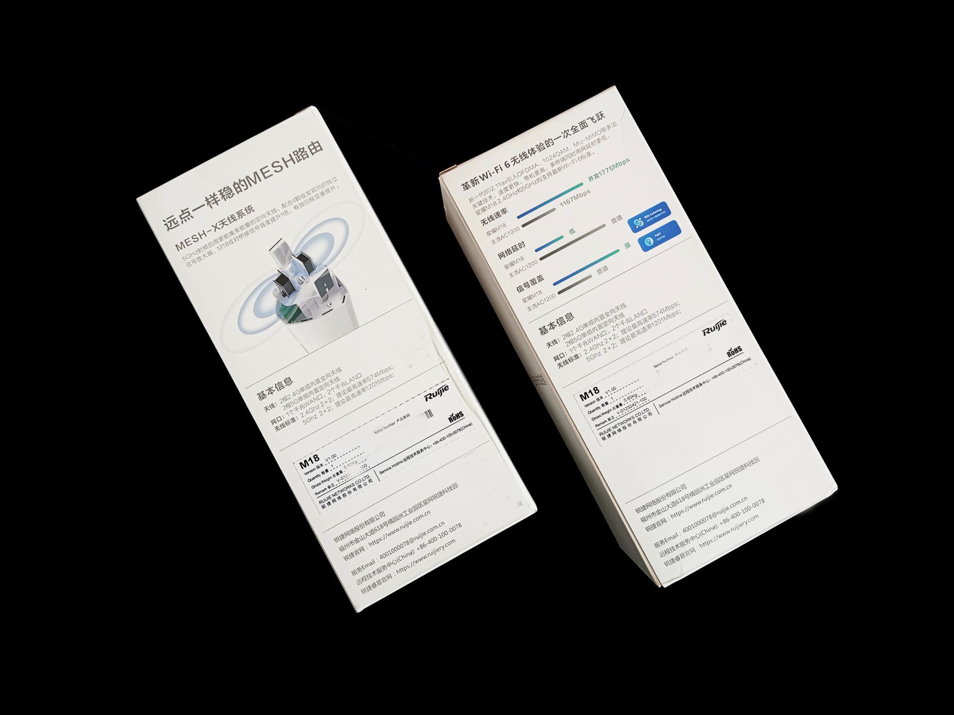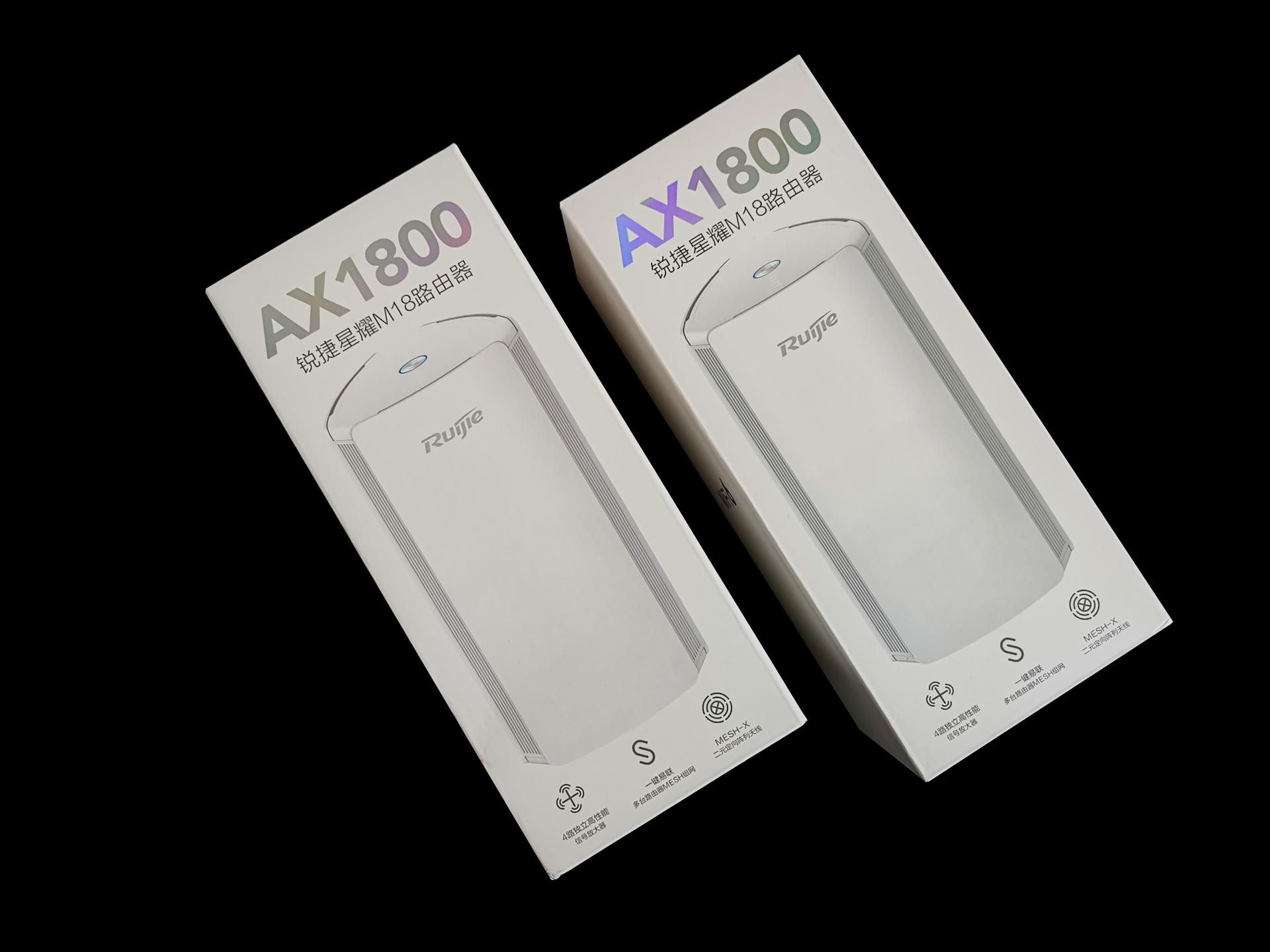 锐捷星耀M18 MESH路由器当然也是由2台及以上路由组成。锐捷星耀M18 MESH路由器的包装盒非常素雅,包装盒上印制着产品型号和产品示意图,还特地标明了一键易联等特性。