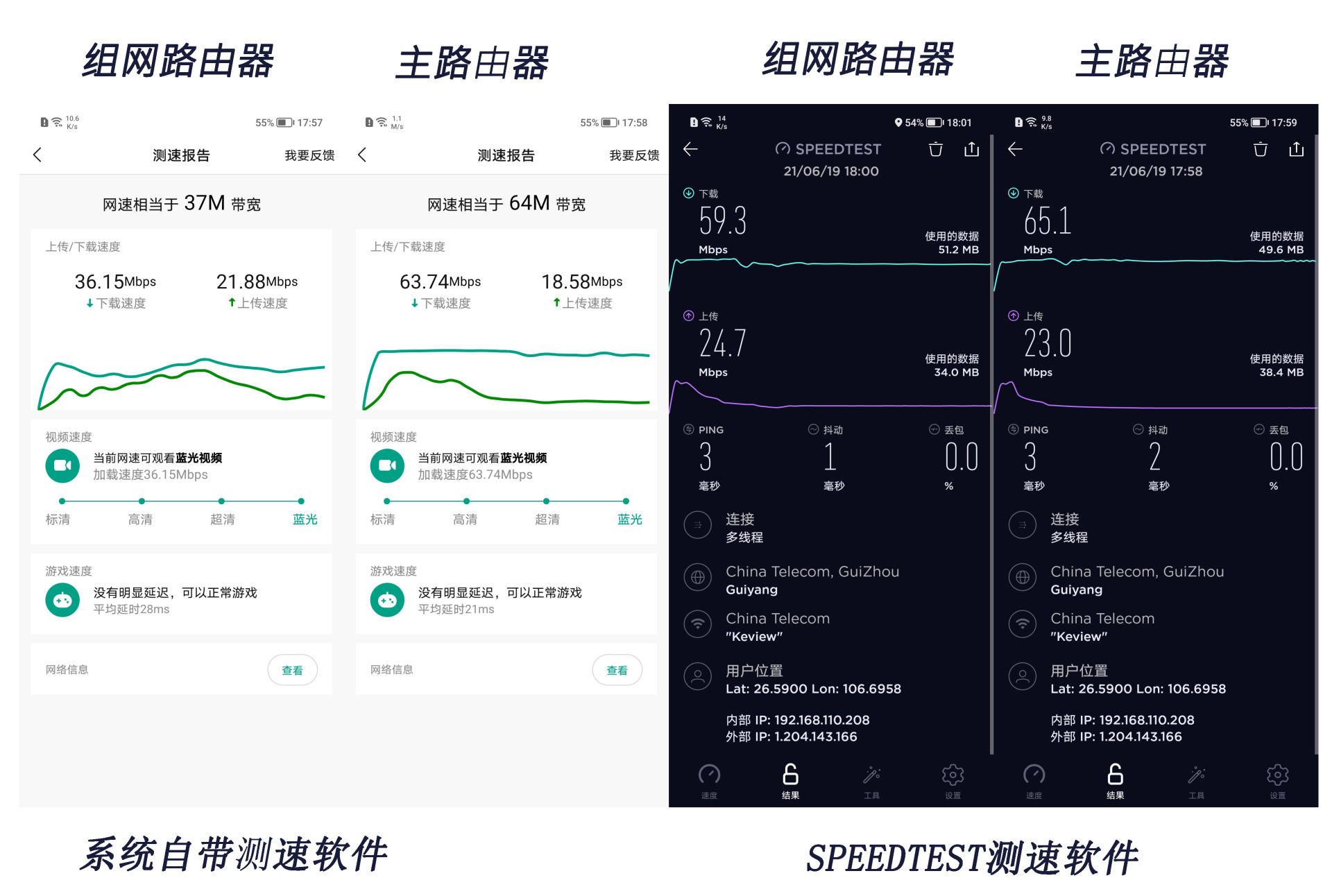 为了检测更换路由后的网速提升,我特地选择了主路由和组网路由在不同位置的网速对比,主路由器我放在了客厅、组网路由器放在了卧室,通过APP自带的测速插件和知名测速软件SPEEDTEST对比,连接主路由的时候,我们的下载速度可达60多Mbps,上传速度可达20Mbps左右,组网路由器下载速度则可达50多Mbps上传速度可达21Mbps左右。