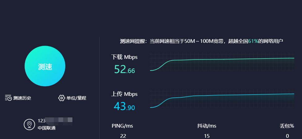 对我来说,用4G省下宽带的费用才是最实惠的,所以,我更关心用这款路由器的4G功能上网时的表现。我把赠送的联通卡激活了,放到路由器里,用电脑测试了一下联通卡的网速,下载52Mbps,上传44Mbps。这个速度还是非常不错的,要知道,我们正常拉的家庭宽带,上传跟下载基本都是不对等的,也就4G能达到这么好的上传效果。