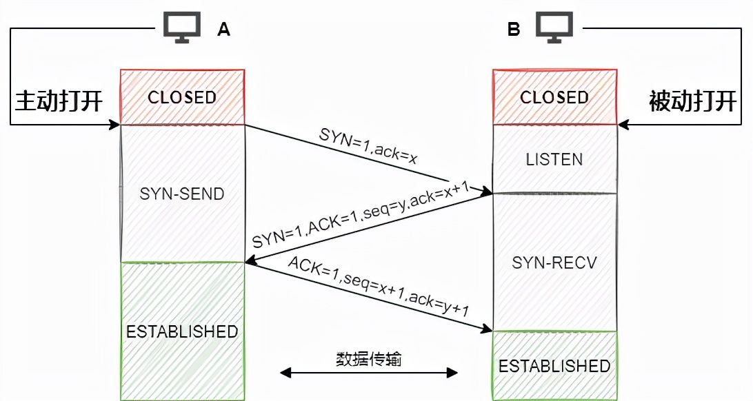 - 第三次握手:客户端收到服务端发来的报文后,会再向服务端发送报文,其中包含标志位ACK=1,序列号seq=x+1,确认号ack=y+1。第三次握手前客户端的状态为SYN-SENT,第三次握手后客户端和服务端的状态都为ESTABLISHED。此时连接建立完成。