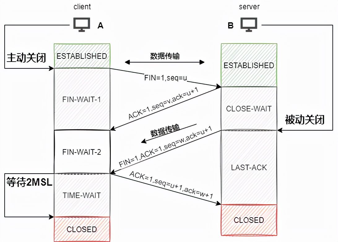 - A收到B的连接释放报文段后,对此发出确认报文段(ACK=1,seq=u+1,ack=w+1),A进入TIME-WAIT(时间等待)状态。此时TCP未释放掉,需要经过时间等待计时器设置的时间2MSL(最大报文段生存时间)后,A才进入CLOSED状态。B收到A发出的确认报文段后关闭连接,若没收到A发出的确认报文段,B就会重传连接释放报文段。