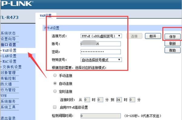5、登录进入到该路由器后台以后点击接口设置选择WAN口设置进入,在出现的主界面选择连接方式为PPPOE,然后输入上网的账号和密码点击保存按钮。