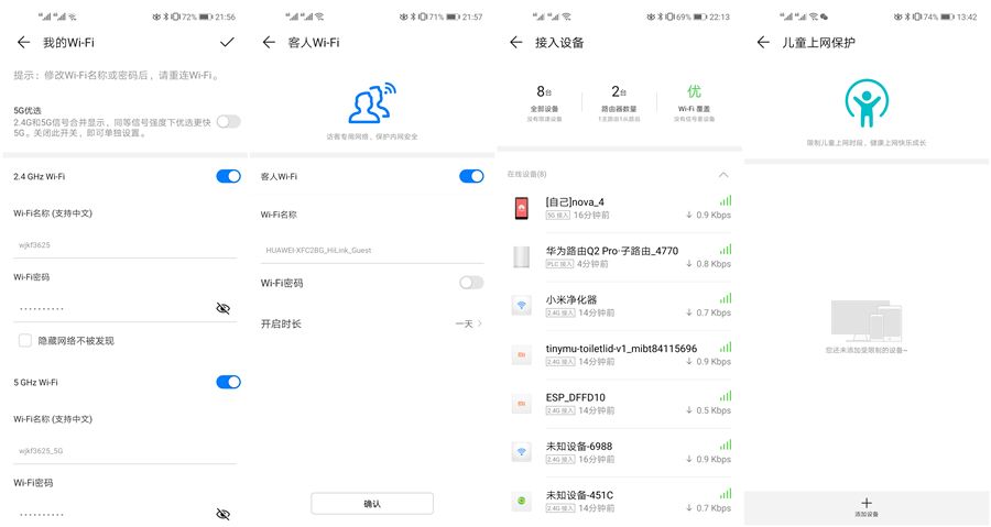 在App内能全程的监控连接到Q2 Pro路由器中的全部设备,也可以对这些设备进行单独的管理,例如限速、禁止上网、客人WiFi、设置儿童上网保护(设立使用WiFi时间段)等等。