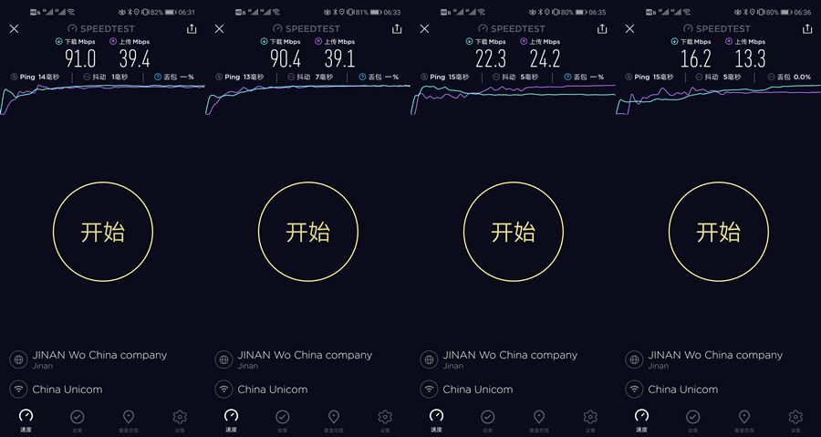 在只有母路由器的四个地方的下载速度依次为91.0、90.4、22.3(信号为2.4G)和16.2(信号为2.4G) Mbps,上传速度为39.4、39.1、24.2和13.3 Mbps,信号强度的衰减还是很大的,所以,在厨房这个位置,从来都不能边做饭边用手机开WiFi听新闻。
