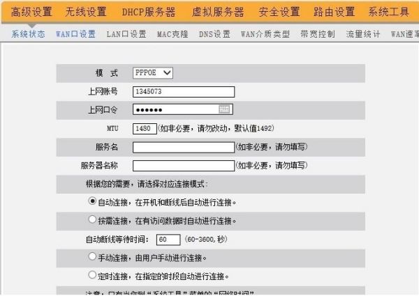 进入高级设置中的WAN口设置。如果宽带服务需要拨号请选择PPPOE拨号,否则可以选择DHCP自动获取。PPPOE拨号要输入宽带账号密码,连接模式选择自动连接。DHCP自动获取则不用填写。